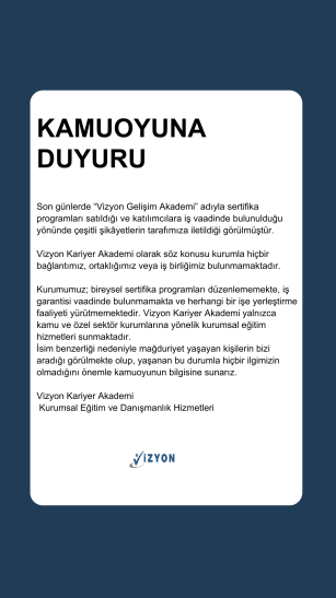 Vizyon Kariyer Akademi yalnızca kamu ve özel sektör kuruluşlarına yönelik kurumsal eğitim hizmetleri sunmaktadır. İsim benzerliğinden kaynaklanan karışıklık nedeniyle tarafımıza gelen başvurularla hiçbir ilgimizin bulunmadığını kamuoyunun bilgisine saygıyla sunarız.